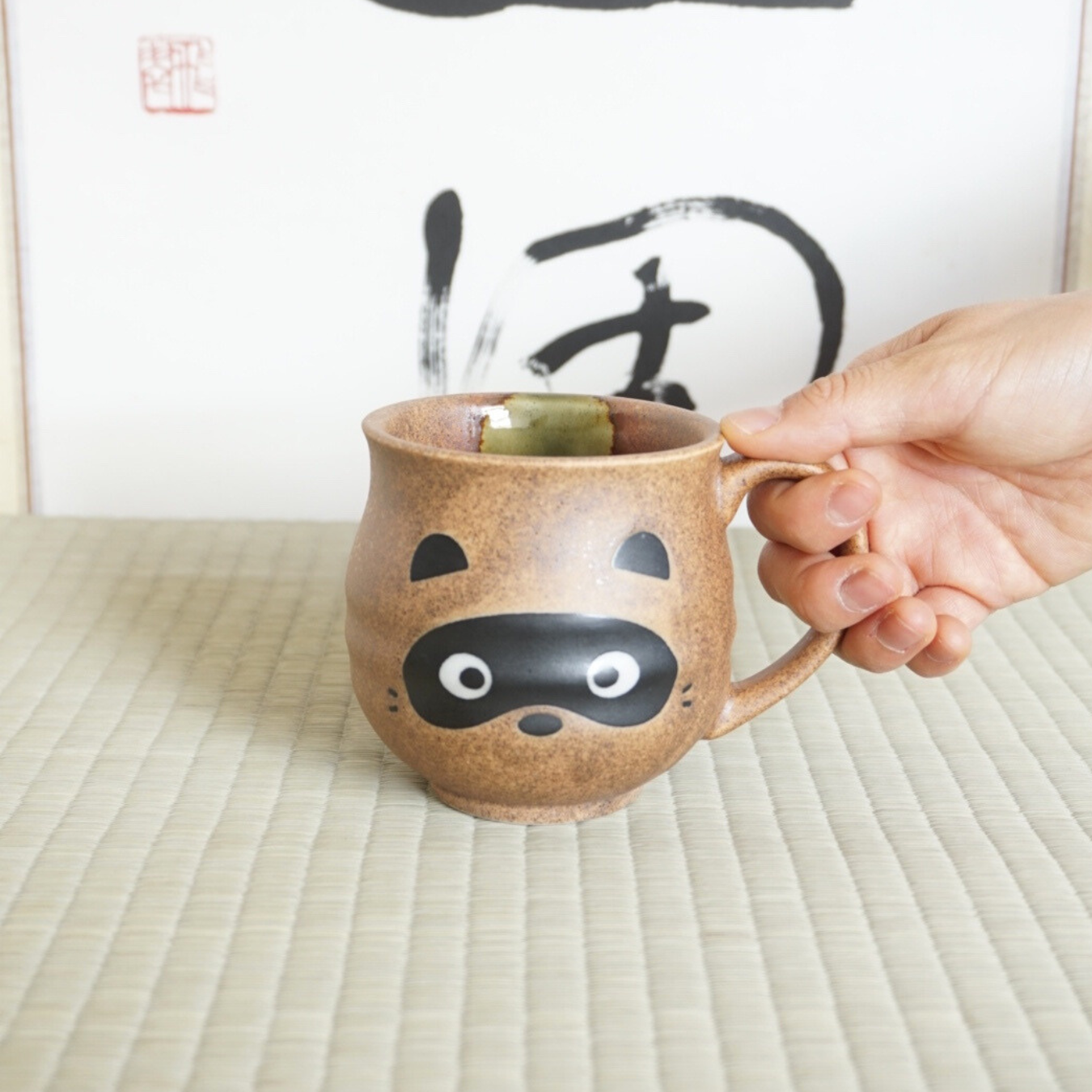 Un mug tanuki en céramique, à la texture granuleuse et ancestral.